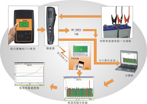 4、完成测试后,转存到 U 盘(SBM-3000或以后系列)或通过USB通信电缆将测试数据下载到计算机中。利用随机所附的分析软件,生成测试报告(报告包括电压、电阻、容量估算直方图,以及趋势曲线)。